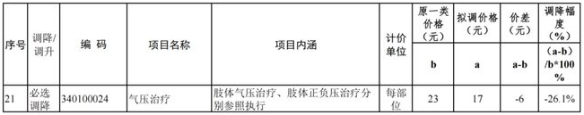 降價最明顯的醫療項目主要是機械檢查類項目。其中,有19個影像化驗類項目在降價范圍內,這些項目主要依賴檢測儀器。此外,氣壓治療也是一種在康復科中常見的物理治療項目,其價格也有所下降。